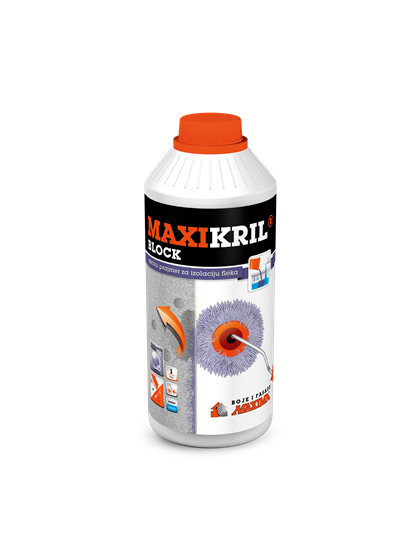 MAXIKRIL Block je akrilna impregnacija za blokadu, odnosno izolaciju mrlja koje su topive u vodi, poput mrlja od duhanskog dima, čađe, mrlja izazvanih prokišnjavanjem ili poplavom. MAXIKRIL Block se nanosi na suhe i čiste žbukane, gletane površine i gips kartonske ploče u interijerima. MAXIKRIL Block nije efikasan ako su površine koje su zaprljane prethodno tretirane sličnim sredstvima koja nisu na vodenoj osnovi.
